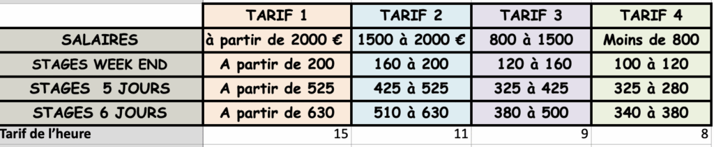 En paiement individuel les tarifs sont proposés selon les revenus (salaires, pensions, allocations, revenus du patrimoine…) et décidés ensemble lors le l’entretien téléphonique d’accueil.